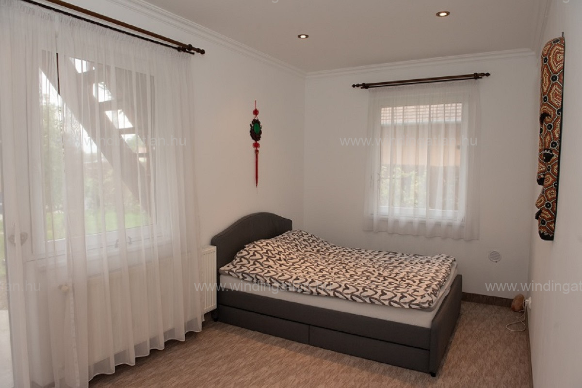 Az utána nyíló szobából egy igényes dolgozószobát is kialakítottak. Itt található még egy külön nyíló hálószoba, amin keresztül jutunk a világos, egyedi stílust képviselt fedett teraszra.