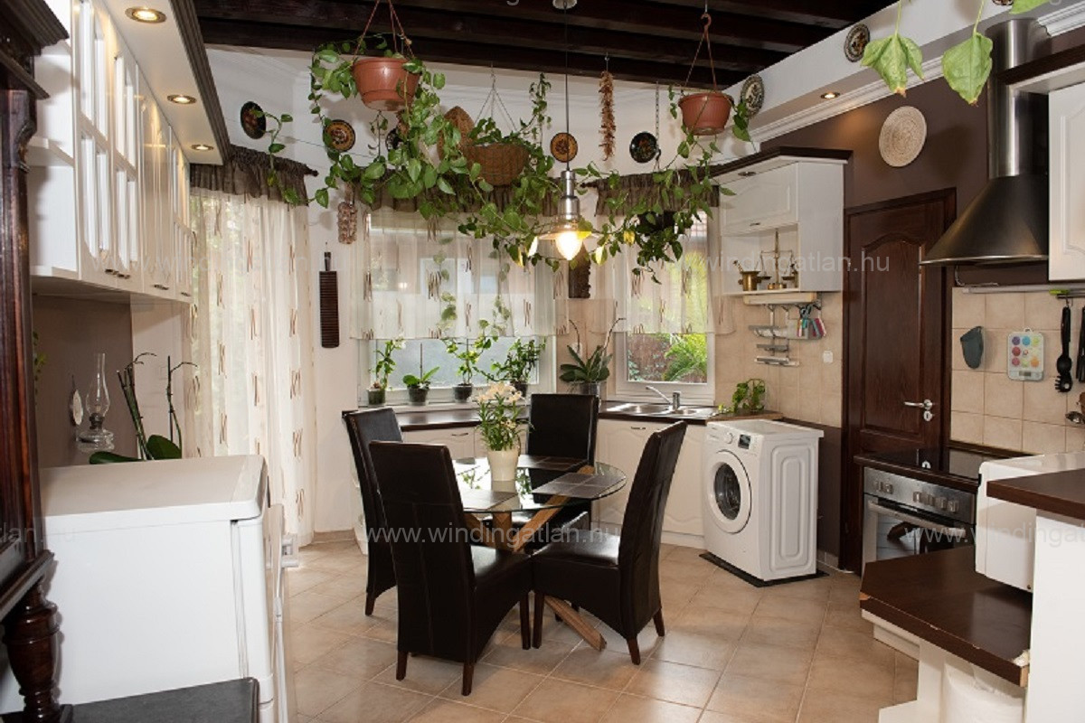 Beljebb lépve elénk tárul a tágas étkezős konyha, mely a sok ablakának köszönhetően kifejezetten világos, napos. A beépített igényes konyhabútor, háztartási gépekkel együtt az ár részét képezi. Balra található a nappali, amit egyedi elképzelés alapján gipszkarton dizájnokkal tettek hangulatossá.