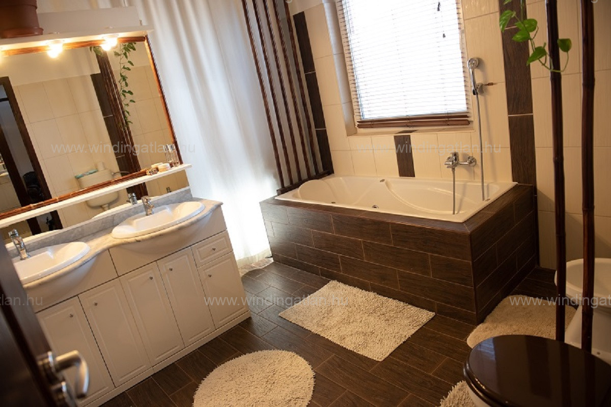 A földszinti lakás 93 nm: a lakásba lépve az előszobából jobbra található a dupla mosdóval – hidromasszázs káddal – üvegfalas épített zuhanyzóval, WC, bidével és gépészeti részleggel kiépített fürdőszoba, plusz külön álló WC.