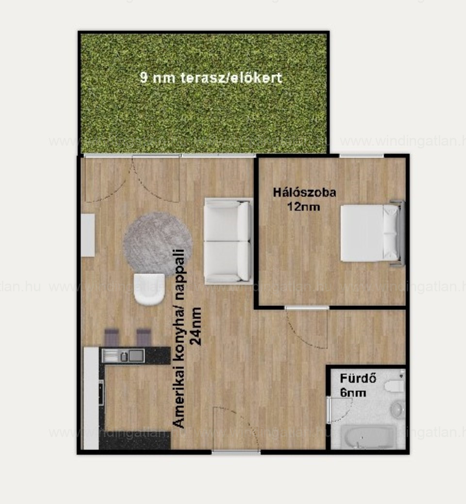 A lakás különlegessége a 9 m²-es saját előkert, ahol kényelmesen kávézhatsz, pihenhetsz, vagy akár baráti összejöveteleket tarthatsz.