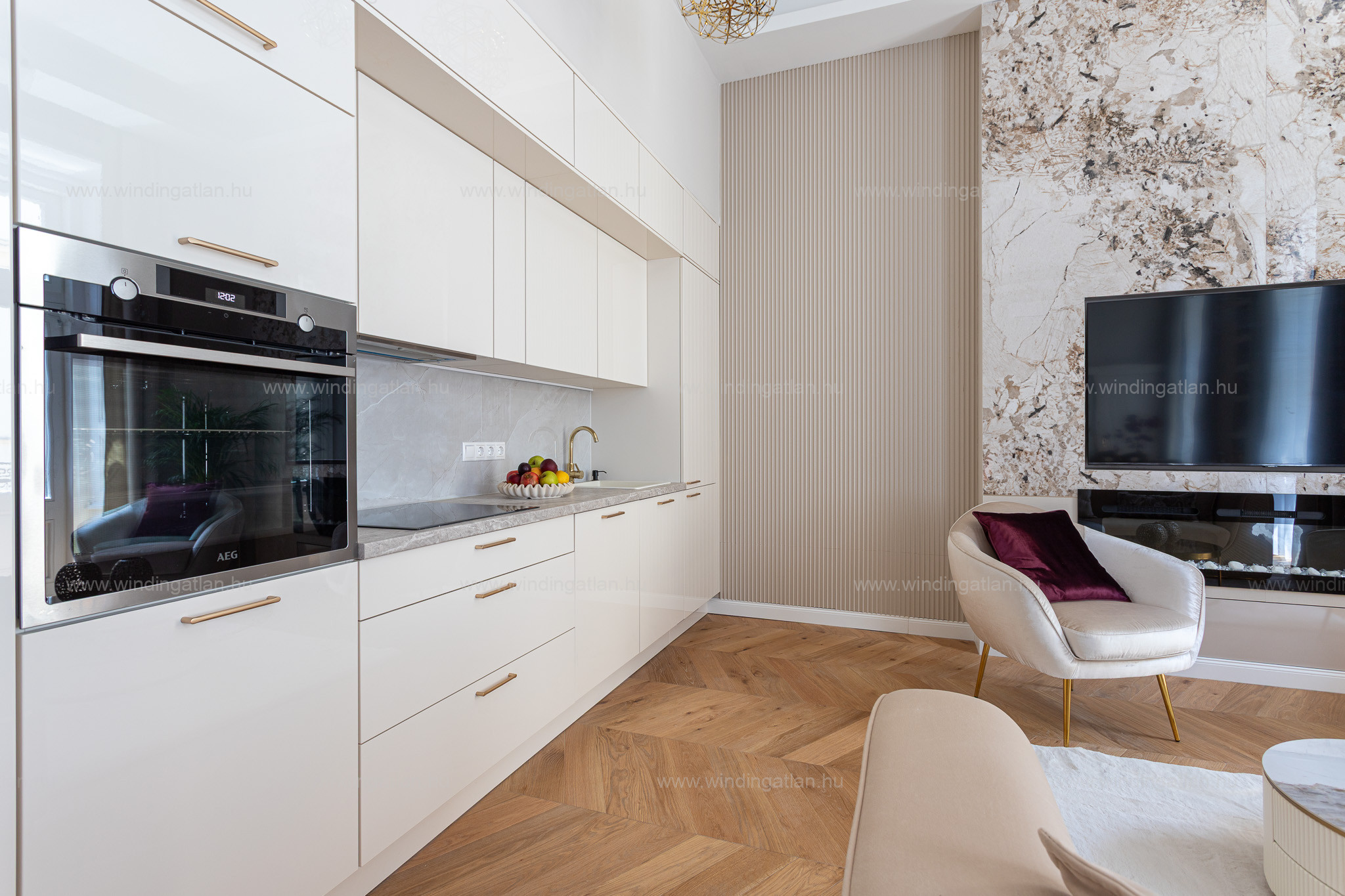 * Teljesen gépesített AEG konyha: mosogatógép, hűtő fagyasztóval, sütő, főzőlap, páraelszívó, mosógép