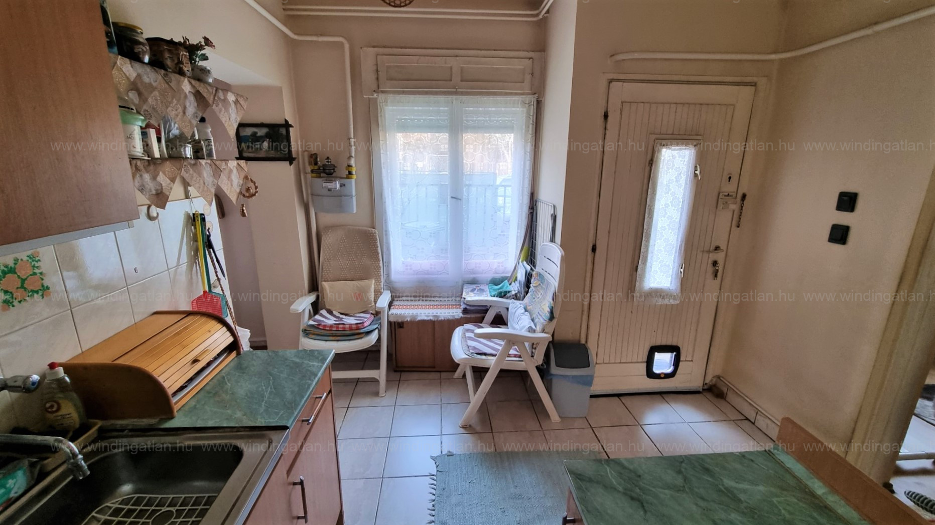 Az ingatlanba az utcáról előkerten keresztül külön bejáraton jutunk be, ahonnan az előtérrel egybenyitott konyhába érkezünk. Jobbra található a félszoba, amit jelenleg étkezőnek használnak.