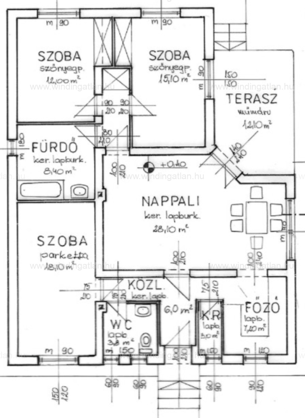 Az ingatlanban egy nappali, 3 szoba, konyha, spejz, fürdőszoba, 2 wc, előtér és közlekedő lett kialakítva.