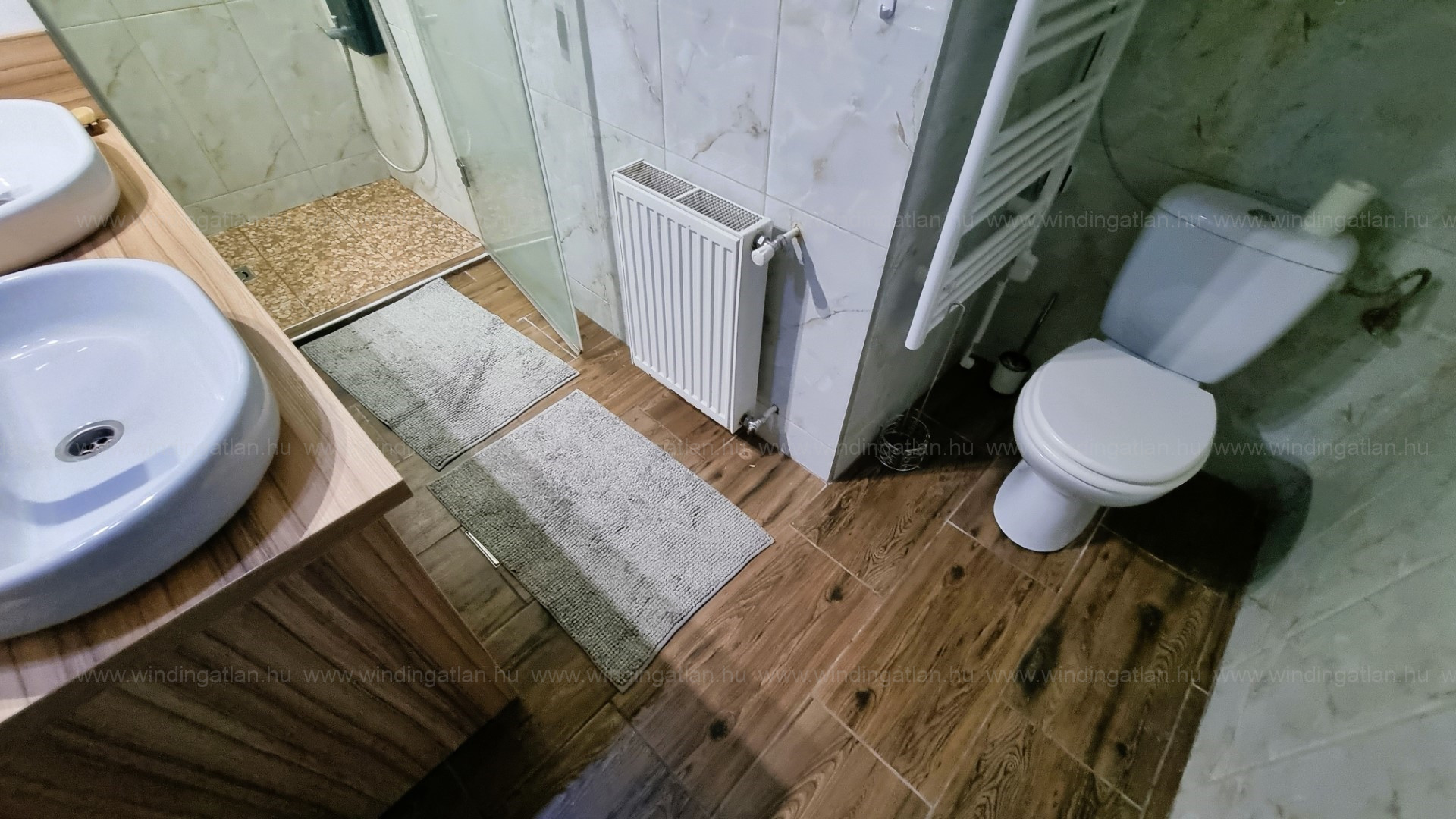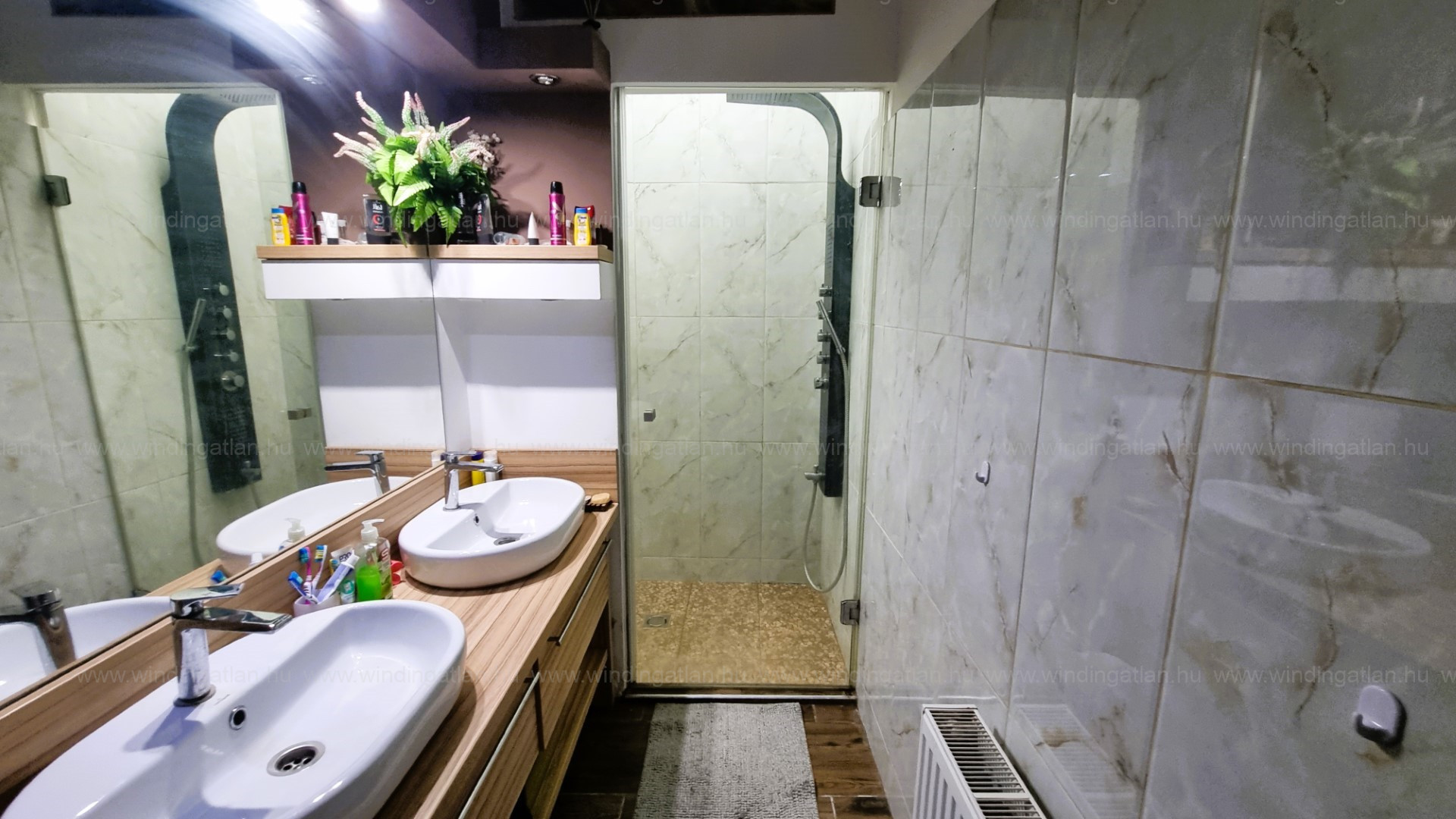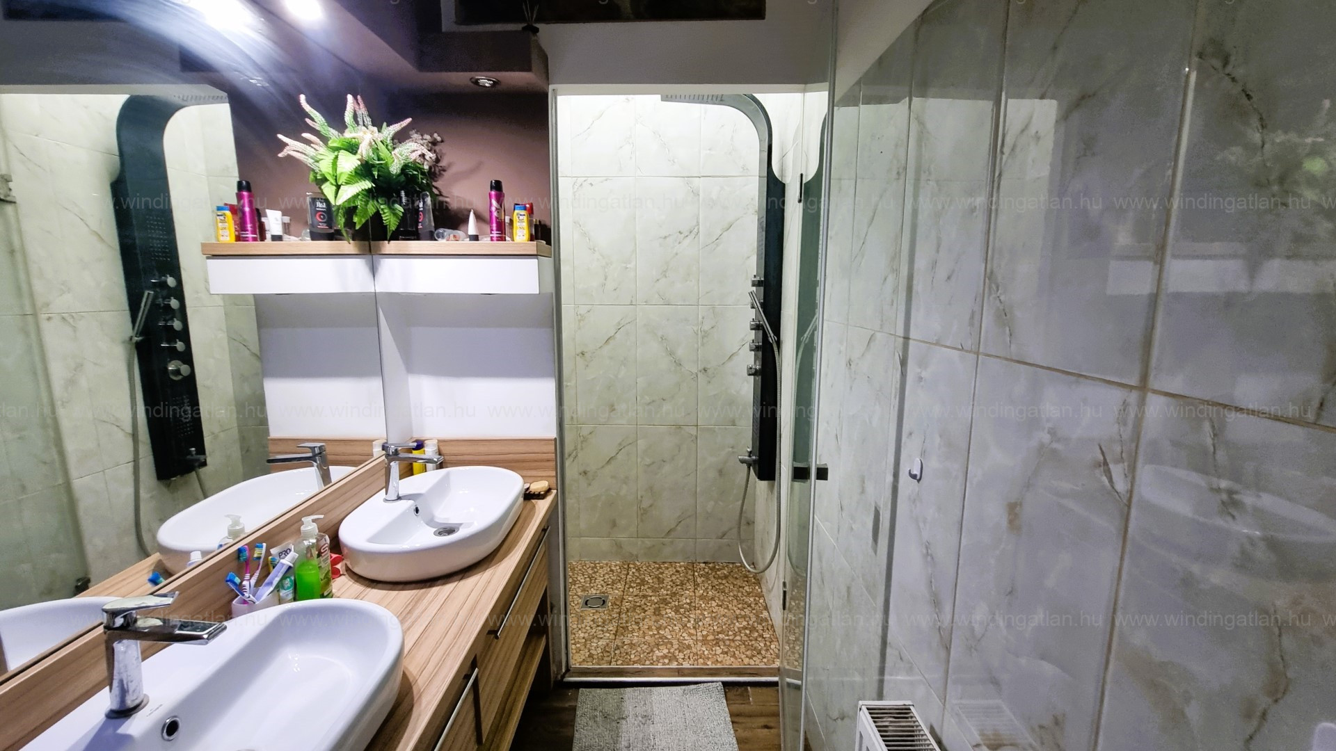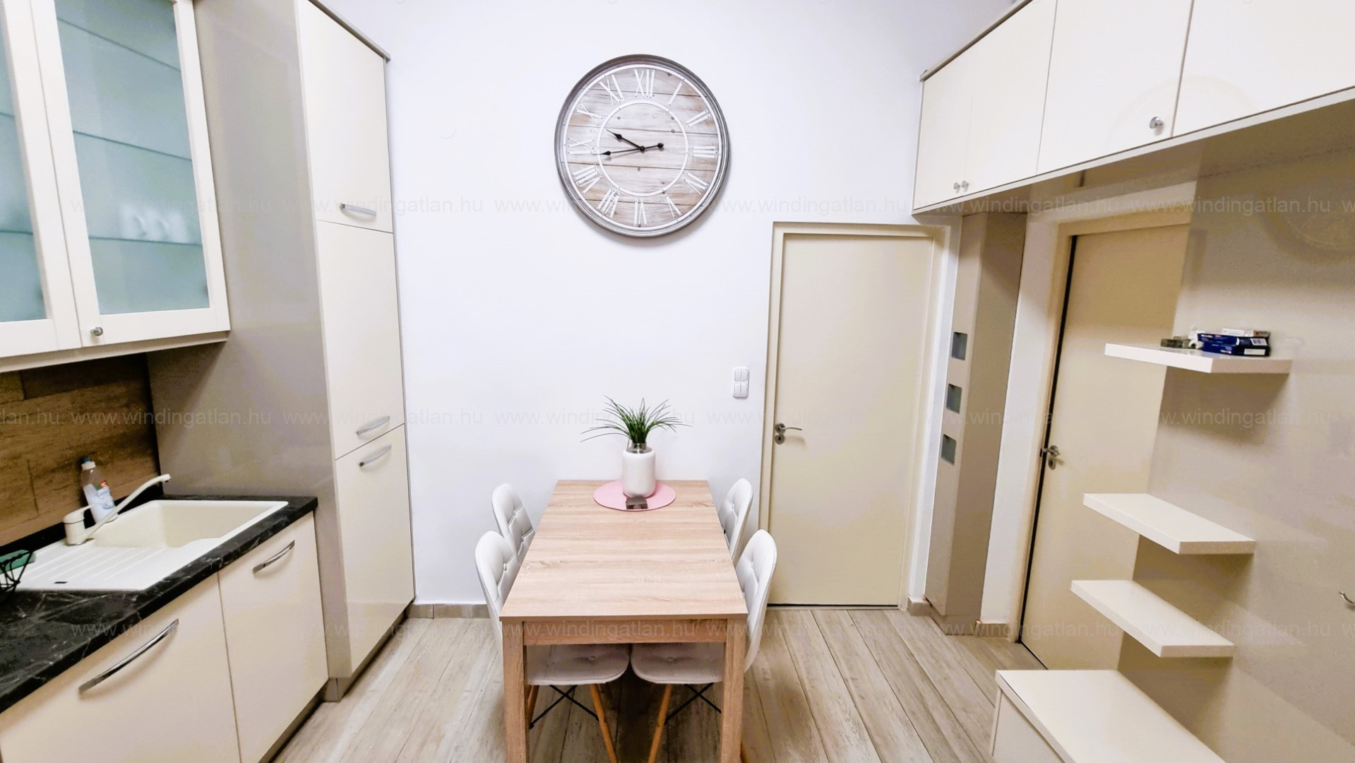 Az ingatlanba lépve egy ablakos, étkezős konyhába lépünk. Innen jutunk be a zuhanyzós fürdőszobába illetve a tágas nappaliba.