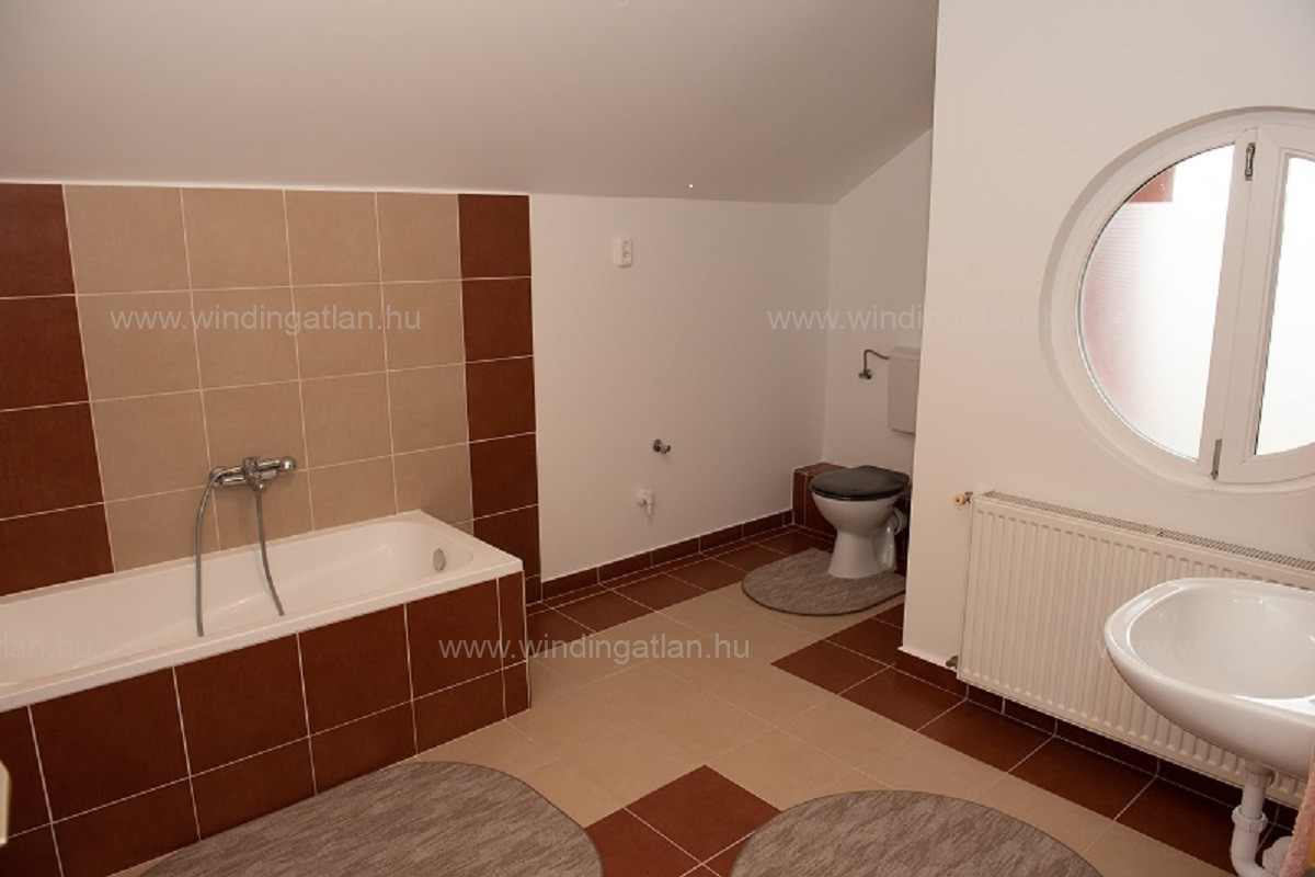 A földszinti lakás 93 nm: a lakásba lépve az előszobából jobbra található a dupla mosdóval – hidromasszázs káddal – üvegfalas épített zuhanyzóval, WC, bidével és gépészeti részleggel kiépített fürdőszoba, plusz külön álló WC.