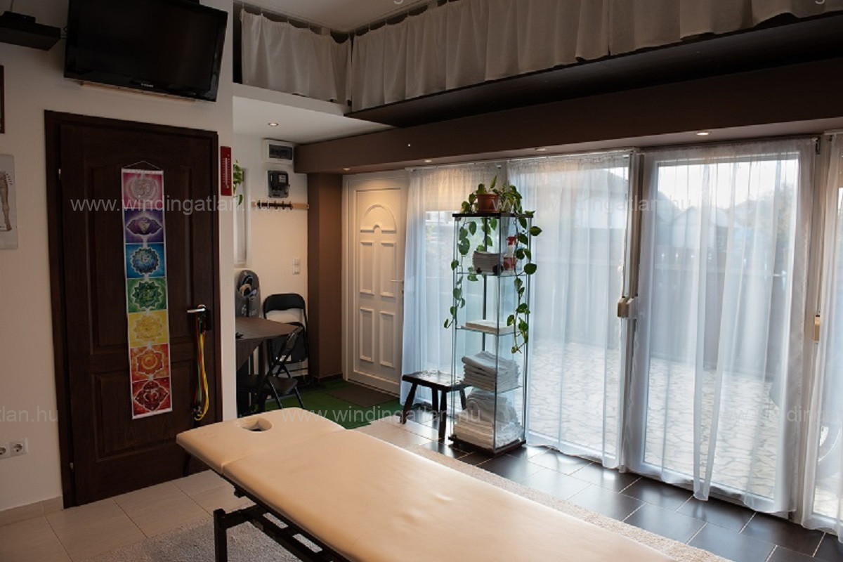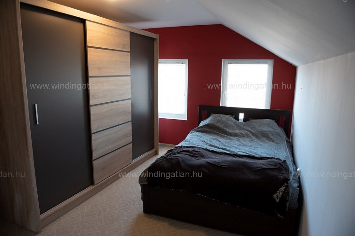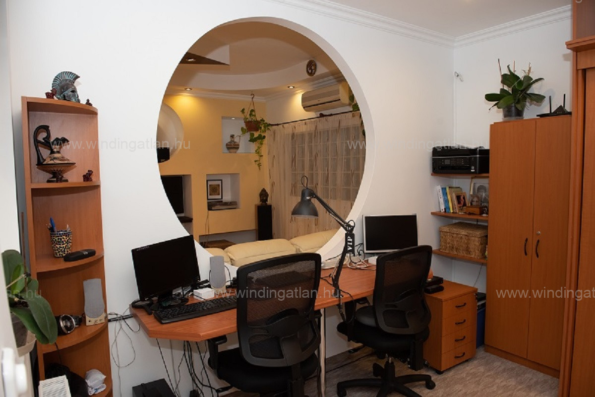 Az utána nyíló szobából egy igényes dolgozószobát is kialakítottak. Itt található még egy külön nyíló hálószoba, amin keresztül jutunk a világos, egyedi stílust képviselt fedett teraszra.