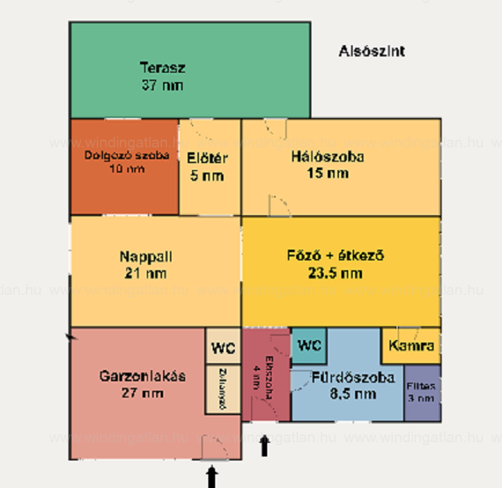 Elrendezése: amerikai konyhás nappali, WC, hidromasszázs zuhanyzó, illetve teljes légelszívással, kandallóval és klímával rendelkező helyiségekből áll.