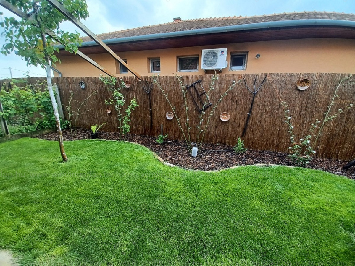 Az öntöző rendszerrel ellátott, gondosan megtervezett, parkosított telek gyönyörű pázsittal, termő gyümölcsfákkal, eperrel, szederrel, málnával, szőlővel beültetve, melynek locsolásáról fúrt kút gondoskodik.