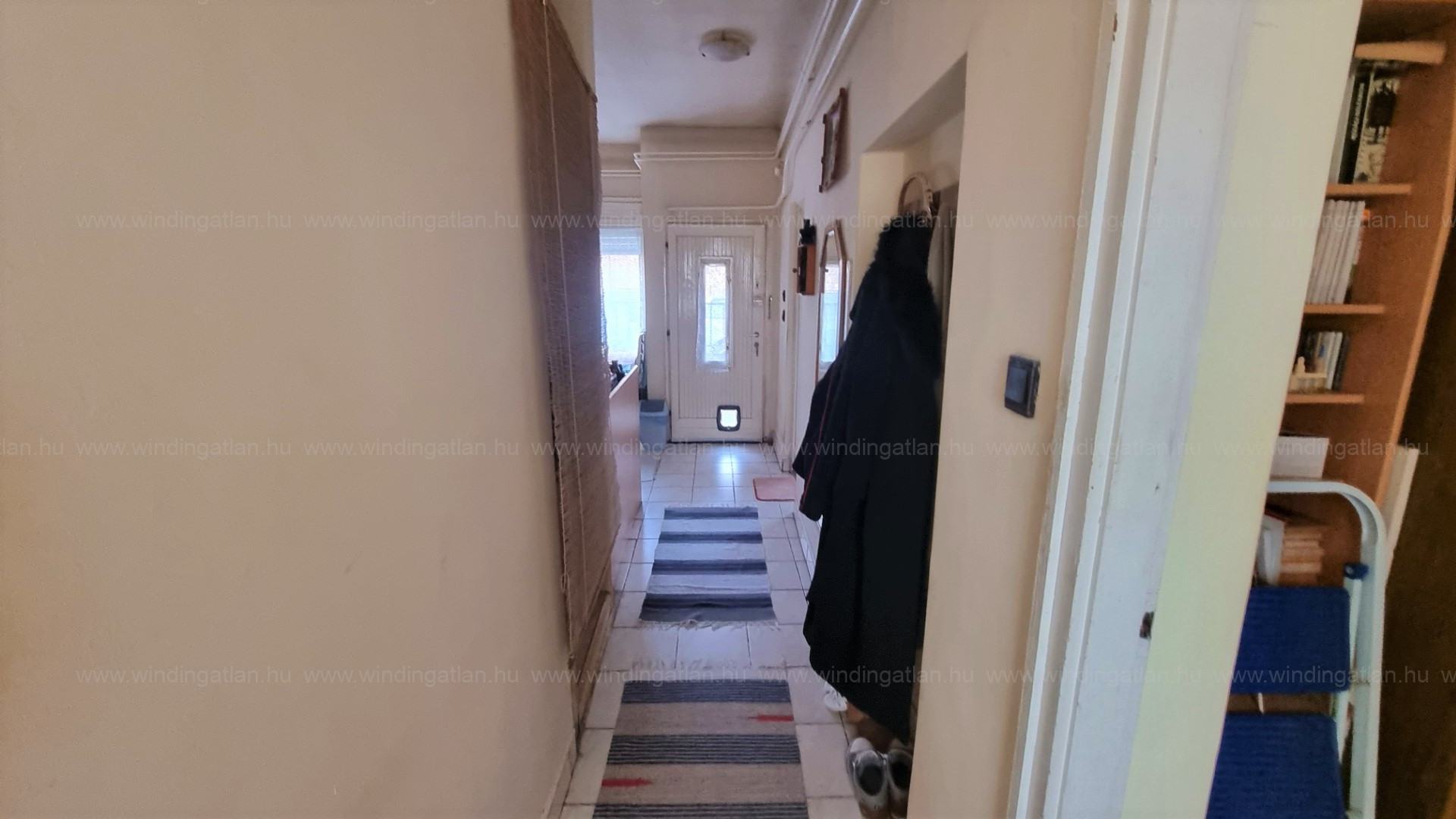 Balra fordulva érkezünk meg a nappaliba a folyosón továbbhaladva pedig a másik nagyszobába, mellyel szemben a kádas fürdőszoba helyezkedik el. A folyosó végén található a kijárat a hátsó teraszhoz (9 nm), a kertrészhez (25 nm).és a fészerhez (7 nm).