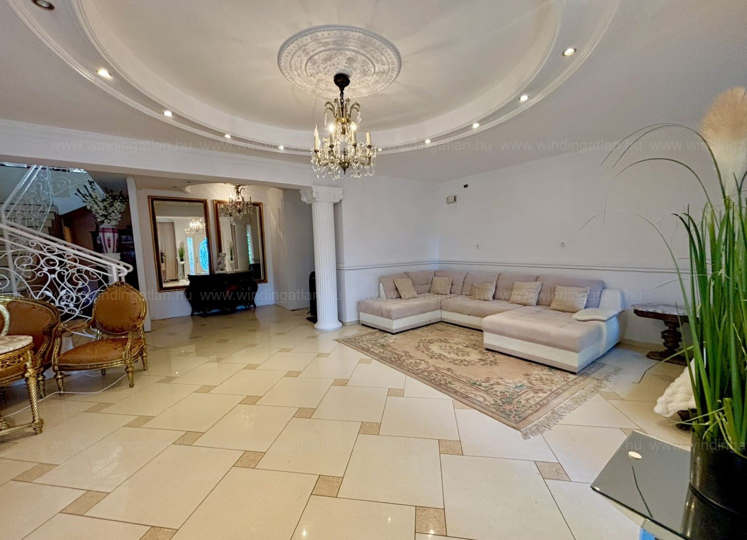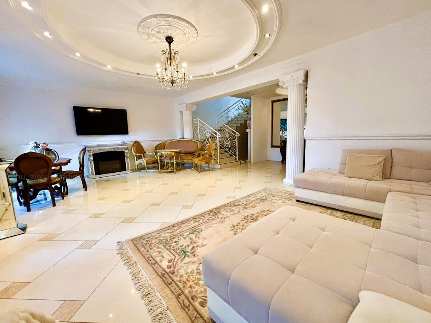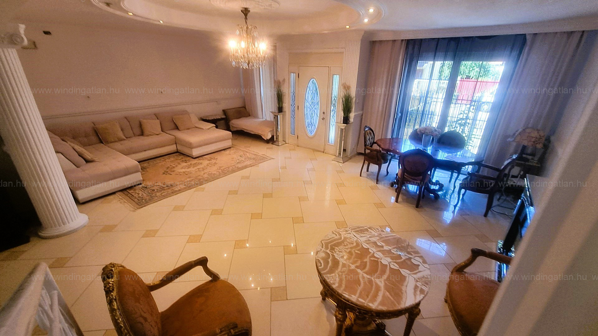 Az ingatlanba lépve egy hatalmas, világos nappaliba jutunk. Itt kapott helyet az étkező és ezen a szinten található még egy tároló helyiség és a lépcső.