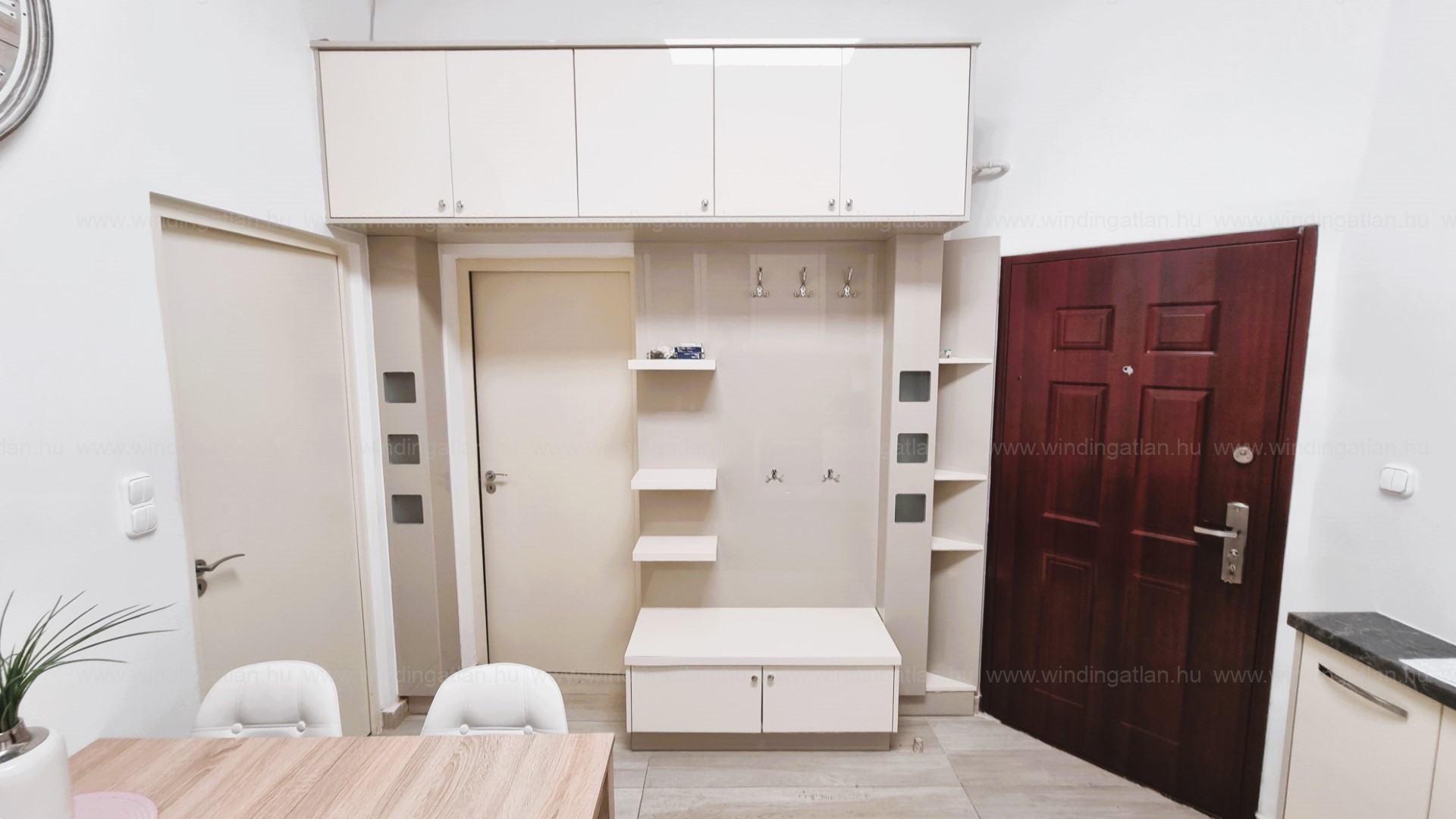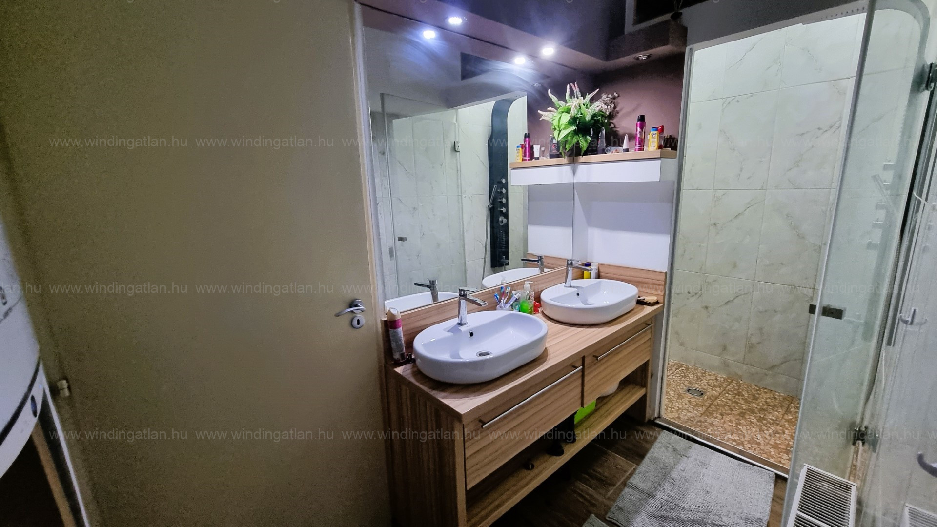 Az ingatlanba lépve egy ablakos, étkezős konyhába lépünk. Innen jutunk be a zuhanyzós fürdőszobába illetve a tágas nappaliba.