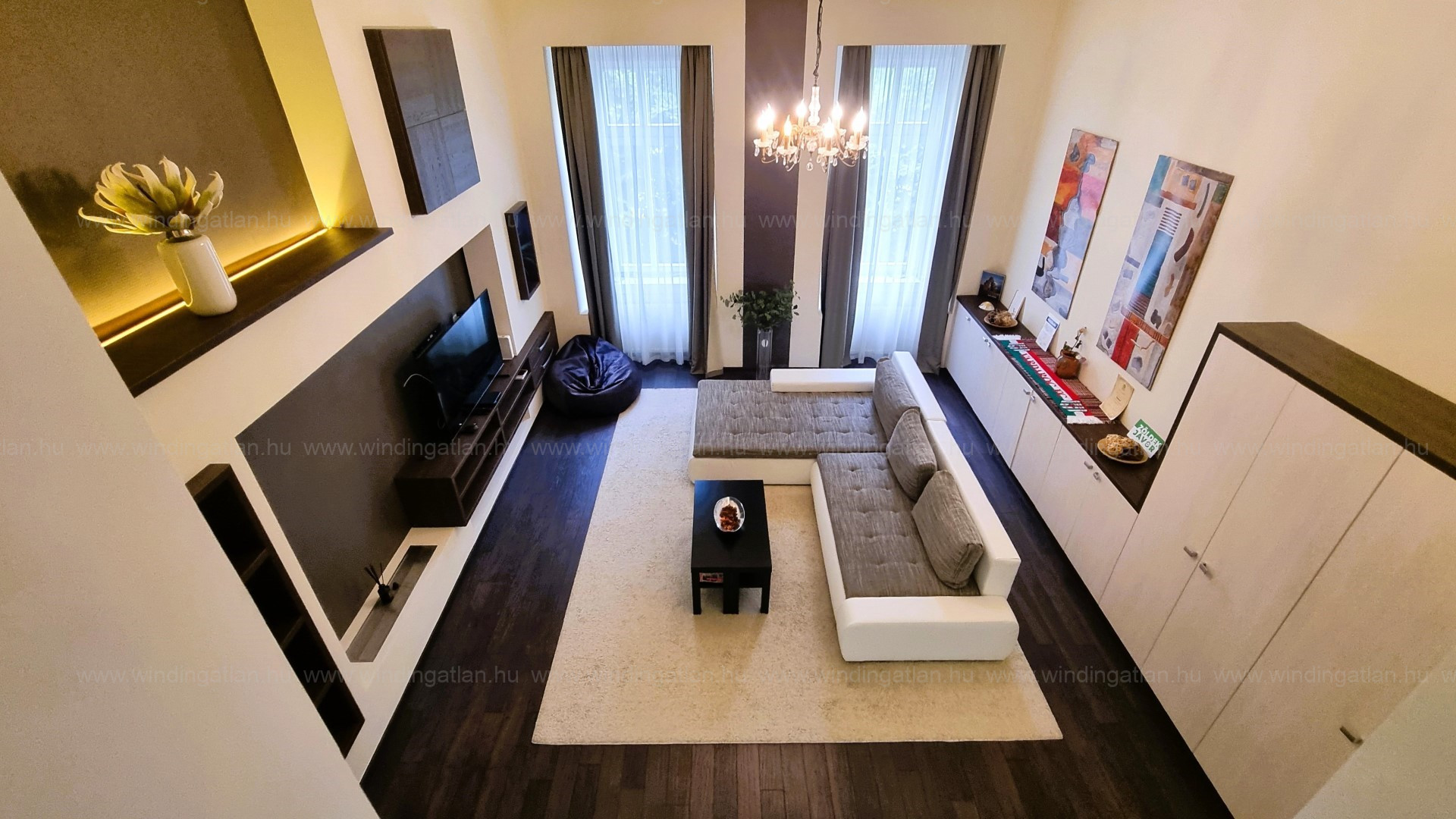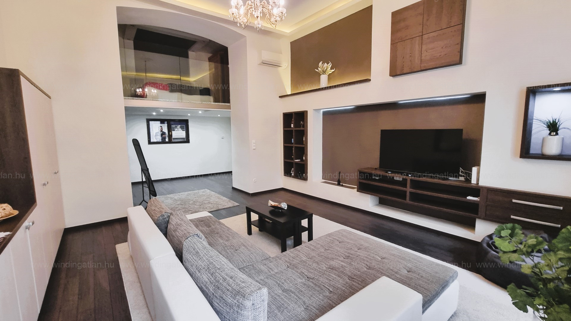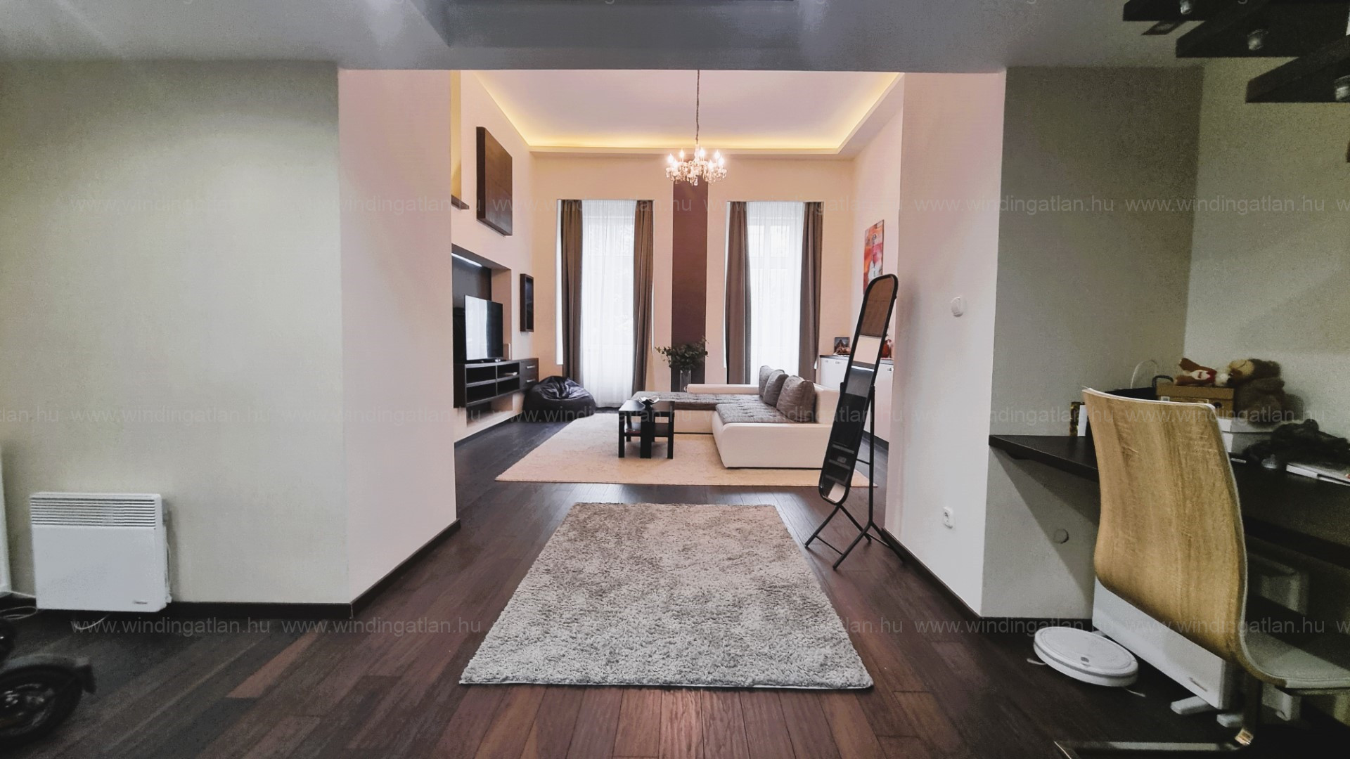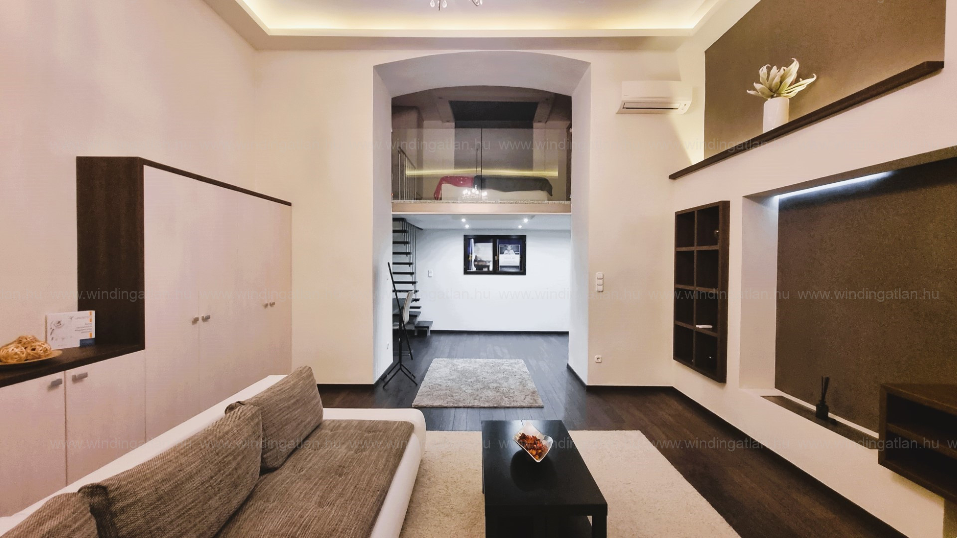 elhelyezkedő, 58 nm-es, 1 szoba (27 nm) + hallos (12 nm) + állógalériás (12 nm), klímás, gyönyörűen felújított, 4 m belmagasságú téglalakást.