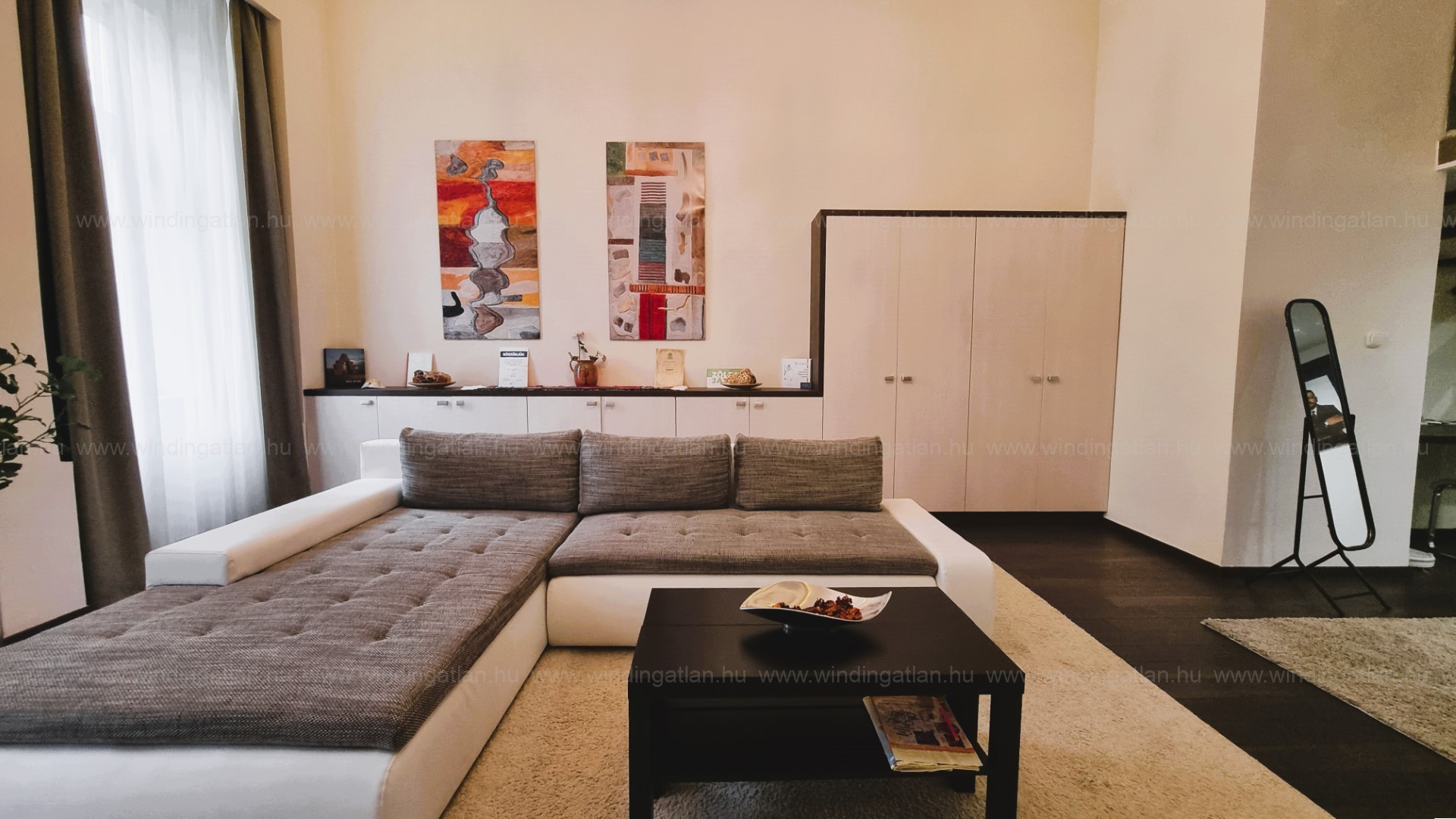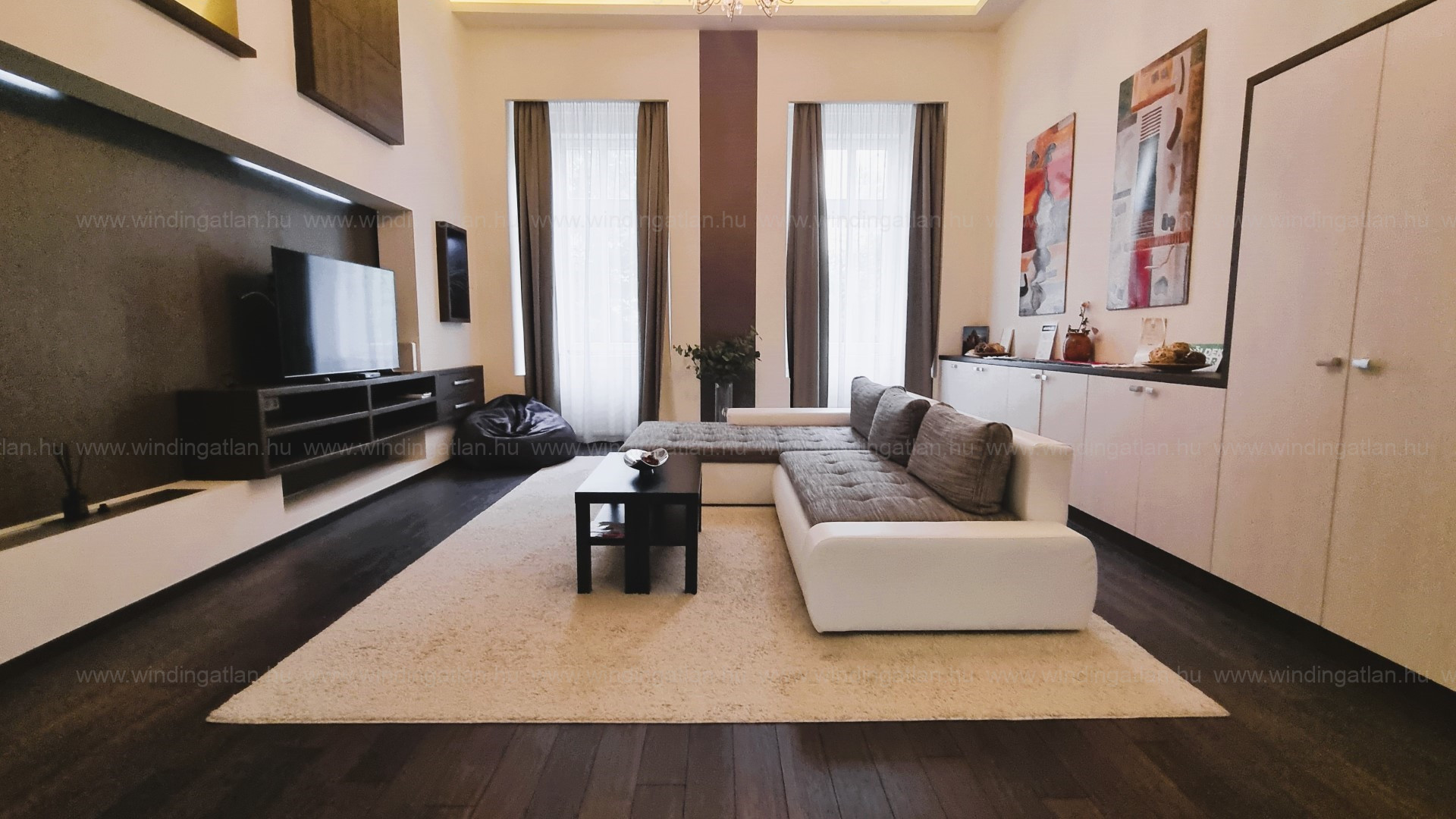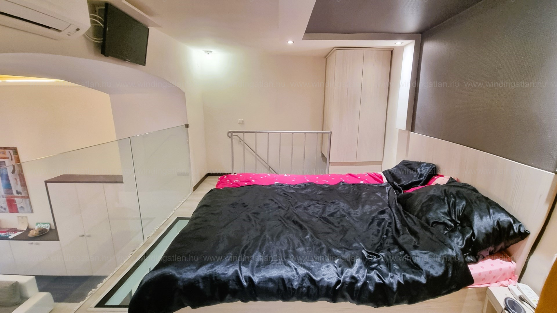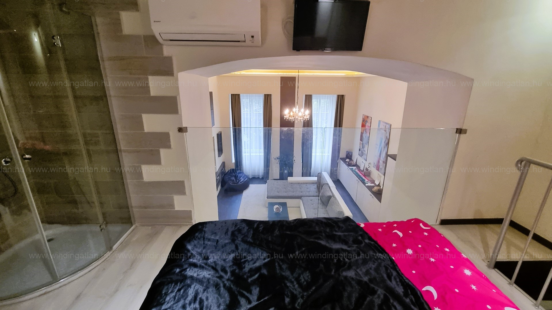 elhelyezkedő, 58 nm-es, 1 szoba (27 nm) + hallos (12 nm) + állógalériás (12 nm), klímás, gyönyörűen felújított, 4 m belmagasságú téglalakást.