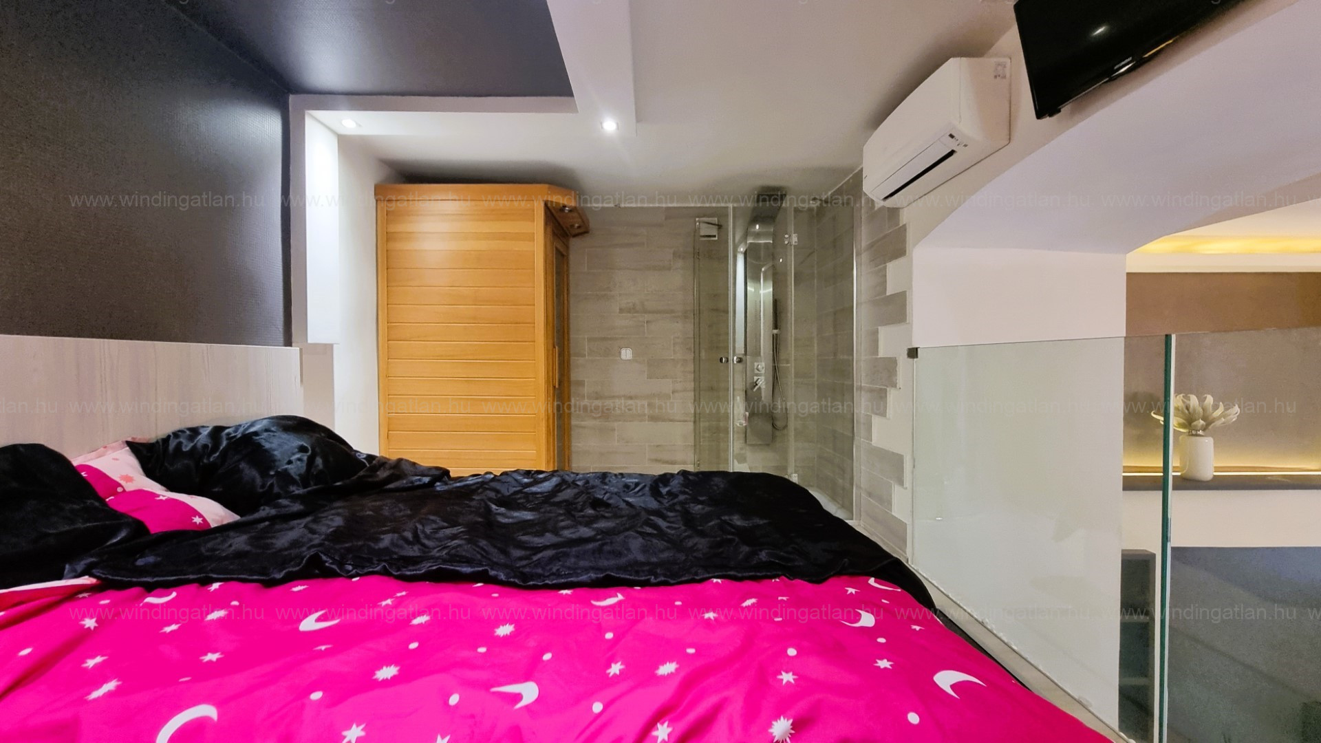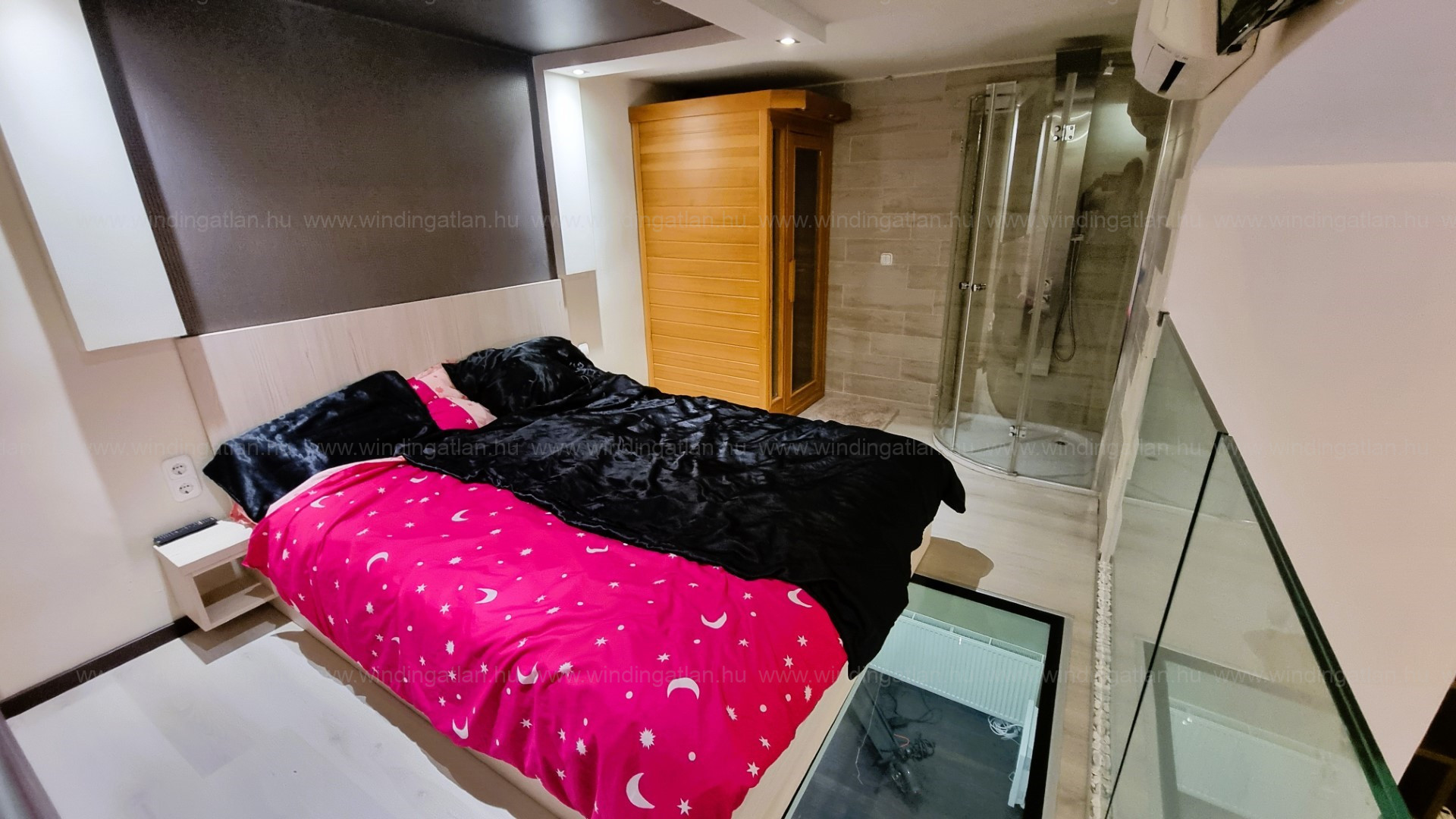 A 12,5 nm-es álló galérián alakították ki a hálószobát és itt található még egy zuhanyzó és egy szauna is.