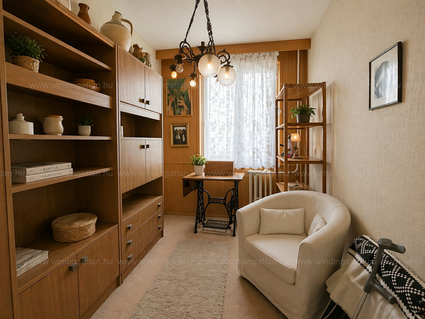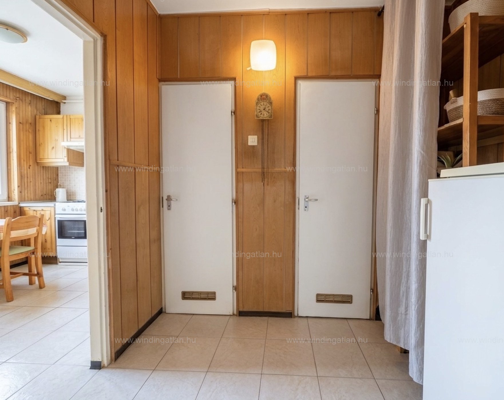 Több helyiségben lambériás falburkolat található, amely kedvelőinek külön értéket képviselhet. A praktikus tárolást az előszobában és az egyik hálószobában található beépített szekrények segítik.